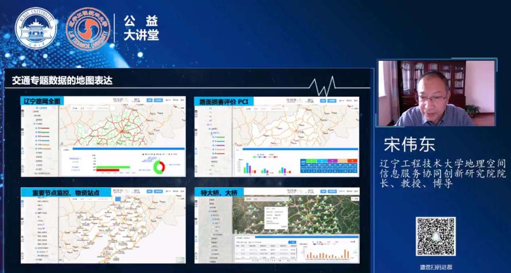 宋伟东教授的报告题目为“现代测绘地理信息技术在智慧交通中的应用”,报告分别从测绘学科未来发展趋势、时空信息服务体现学科价值、智慧交通需要精准时空信息服务进行详细的论述,全面展示了团队在近年来在智慧交通领域的创新成果,包括交通地理信息公共服务平台建设、专题应用系统开发、基于遥感数据的智能信息提取、道路病害的智能识别与评价等。报告内容丰富新颖、技术含量高,近六千人次在线观看了本次直播,历时九十分钟。报告结束后,宋伟东教授还就同行专家和学者所提问题进行了现场解答和探讨。本次直播扩大了我校测绘学科的影响,对一流学科建设起到了积极的推动作用。