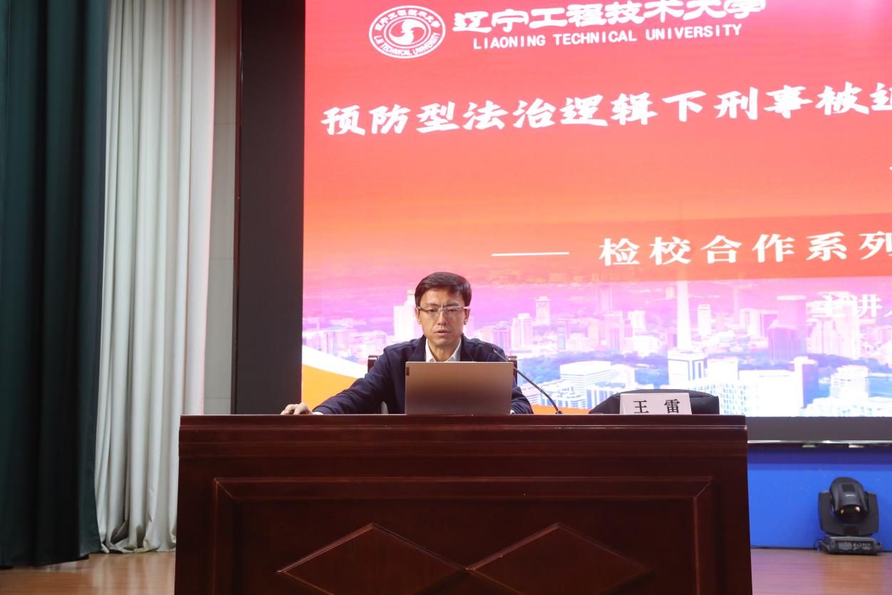为深化“检察实务专家进校园”活动实效、推动检校合作深度融合,9月26日,辽宁省人民检察院党组成员、副检察长王雷受邀为公共管理与法学院师生及驻地检察干警开展刑事检察业务专题授课。本次活动由辽宁工程技术大学党委副书记于海臣主持,阜新市人民检察院、辽宁工程技术大学相关领导以及学院师生、驻地检察干警共计400余人参加。