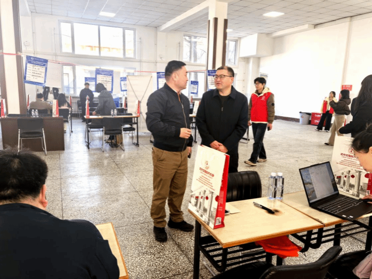 双选会现场,荣德生来到各企业展位前,与招聘负责人亲切交谈,详细询问企业发展规划、岗位需求标准及薪资待遇等情况,明确要求学院相关负责人要持续做好校企对接,精准匹配用人需求,全力促进毕业生高质量充分就业。